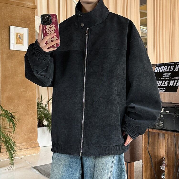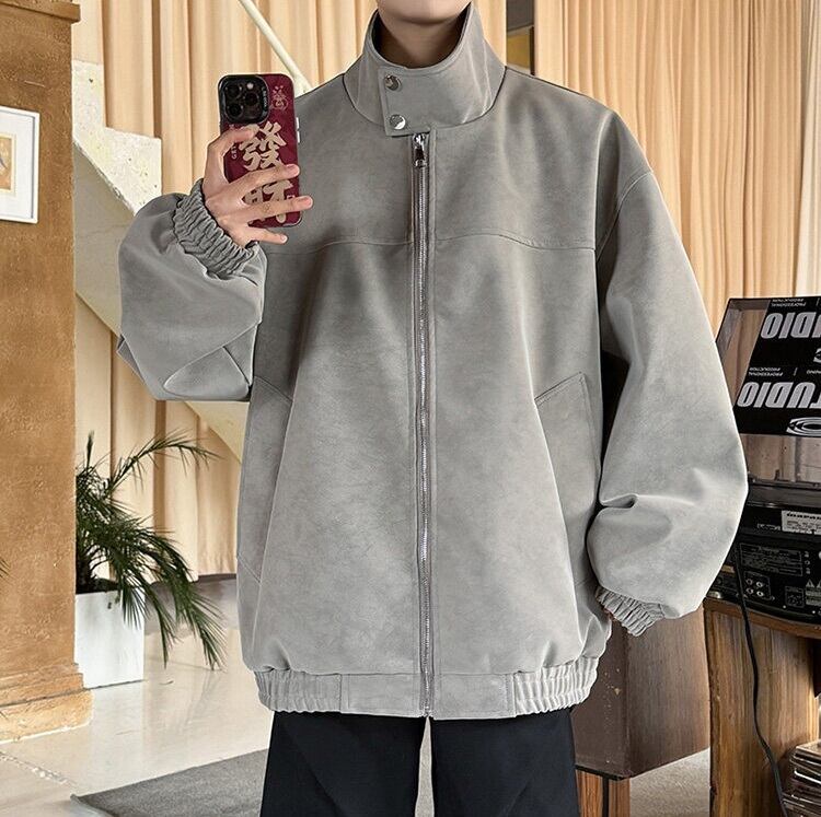 マットな質感が特徴のスエード調ジャケットで、落ち着いた大人の雰囲気を演出。