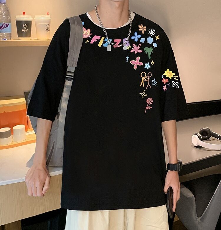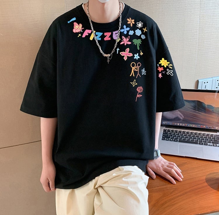 胸元のカラフルなグラフィックが、無地Tには出せない“遊び心”をプラス。