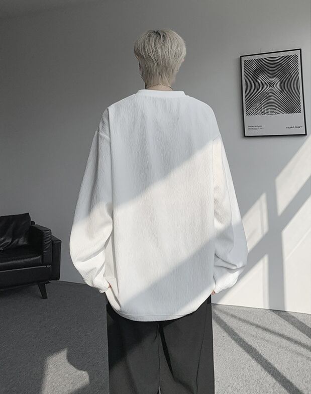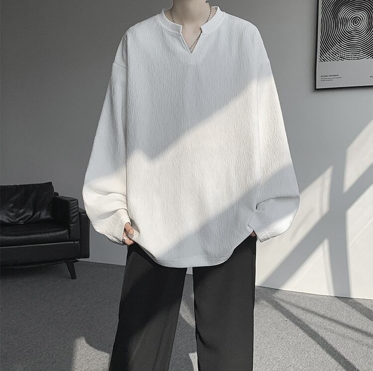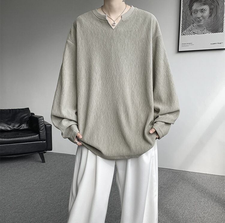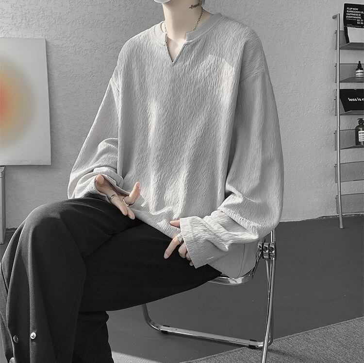 ゆるいシルエットとVネックの軽さが、韓国ストリートの“こなれ感”を自然に表現。