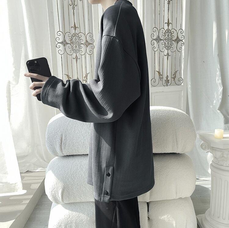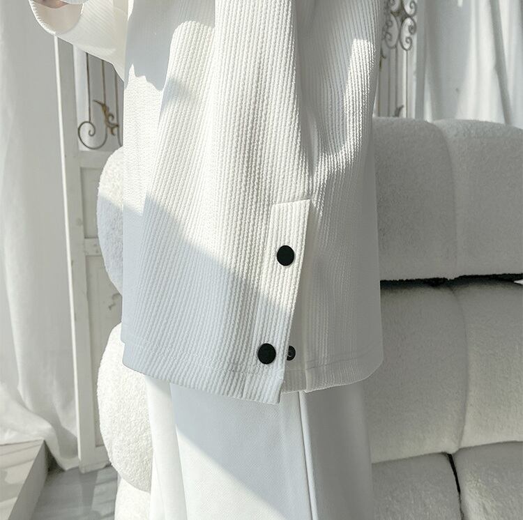 無地のミニマルさに、サイドのボタンがさりげないアクセントとして効く一枚。