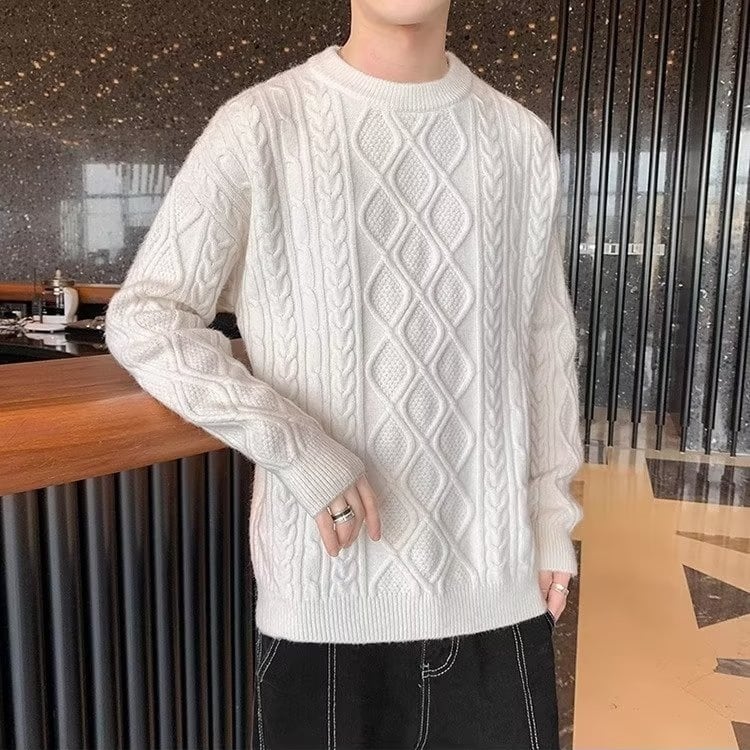 立体的なケーブル編みが、シンプルな装いに深みを与えてくれるラウンドネックニット。