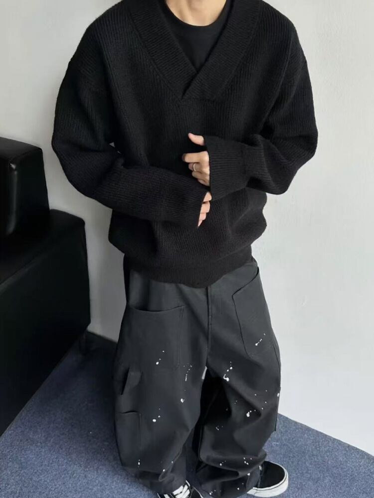 深めのVネックとルーズなシルエットが、抜け感のあるモードストリートを演出。