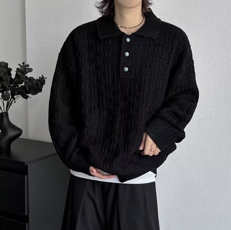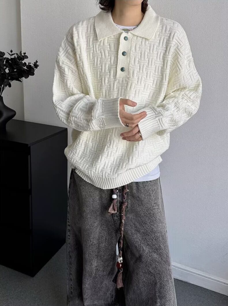 ポロカラーの上品さに、立体的な編み地が加わったモダンなニット。