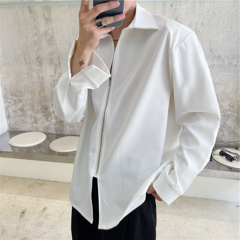 直線的なジップが、シャツの清潔感にモダンなアクセントを添えるデザイン。