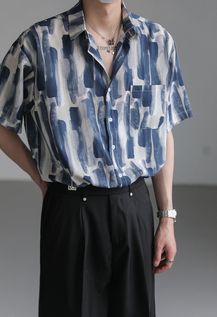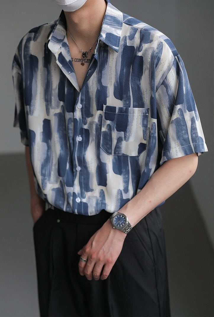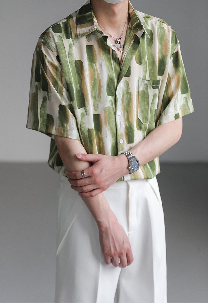 爽やかな配色が清潔感を引き立てる総柄シャツ。